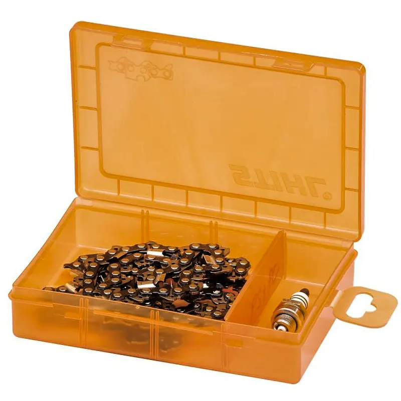 Прочный, лёгкий пластиковый футляр с двумя перегородками. Для хранения пильных цепей.Футляр для хранения пильных цепей сделан из легкой, но ударопрочной пластмассы, надежно защищающей цепи от повреждений. Изнутри разделен на несколько отсеков, препятствующих спутыванию цепей. Надежно закрывается, не допуская попадания внутрь пыли, грязи, влаги, что позволяет сохранять цепи в первоначальном виде долгое время. Имеет эргономичную ручку для переноски, удобную для захвата. Не занимает много места, легко помещается в багажник машины.