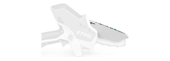 Экран расположен на верхней части шины и обеспечивает безопасность, например, в случае поломки цепи. При необходимости вы можете откинуть щиток на 90° для контроля при проведении точного реза.
