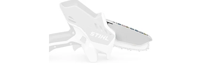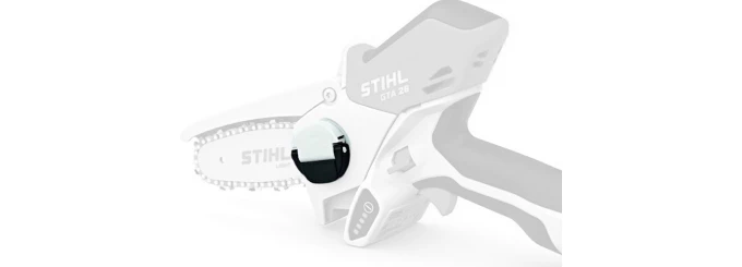 Экран расположен на верхней части шины и обеспечивает безопасность, например, в случае поломки цепи. При необходимости вы можете откинуть щиток на 90° для контроля при проведении точного реза.
