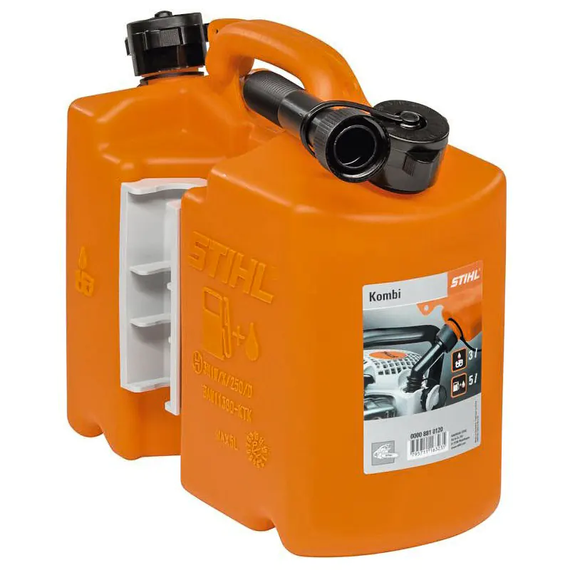 Канистра комбинированная оранжевая 5/3 л Profi (для транспортировки 5 л топлива и 3 л адгезионного масла для пильных цепей) — это удобная сдвоенная емкость для хранения и переноса топлива и адгезионного масла для пильных цепей. Вам больше не придется держать нужные для бензоинструмента компоненты в разных канистрах. В комплекте — заливная трубка, а значит можно в любой момент пополнить запасы. В случае необходимость для пополнения емкости могут использоваться и системы заправки STIHL для топлива и цепного масла.С сертификатом UN, цвет: оранжевый/прозрачный. С двумя крышками-замками (для защиты от детей), выпускной трубкой, заливной трубкой с крышкой и 2 держателями для инструмента.