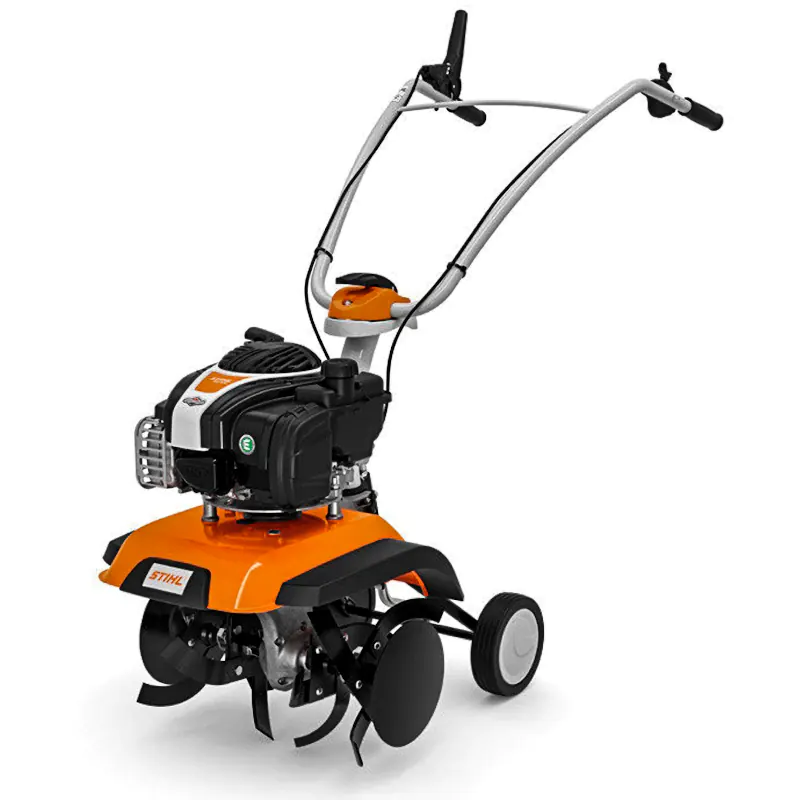 Для перемещения агрегата предусмотрено 2 транспортировочных колеса. При этом они компактно убираются наверх, что удобно при хранении машины, а также при выполнении определенного вида обработки почвы.Рукоятка культиватора настраивается как в горизонтальном, так и вертикальном положении. Дополнительно держатель складывается, что удобно при транспортировке или при хранении мотоблока Stihl MH 445.