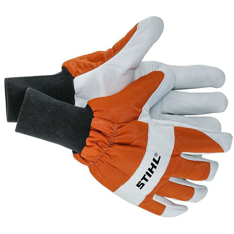 Рабочие перчатки ECONOMY. Очень комфортные перчатки для работы с бензопилой. Сочетание натуральной кожи и тканей, эластичные трикотажные манжеты, защита от порезов на обеих тыльных сторонах кистей, например, во время ухода за деревьями. Отвечает требованиям EN 381, степень защиты 0 (соответствует 16 м/с).